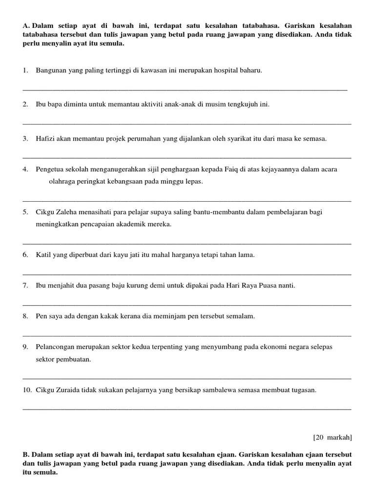 Dalam setiap ayat di bawah ini, terdapat satu kesalahan tatabahasa.